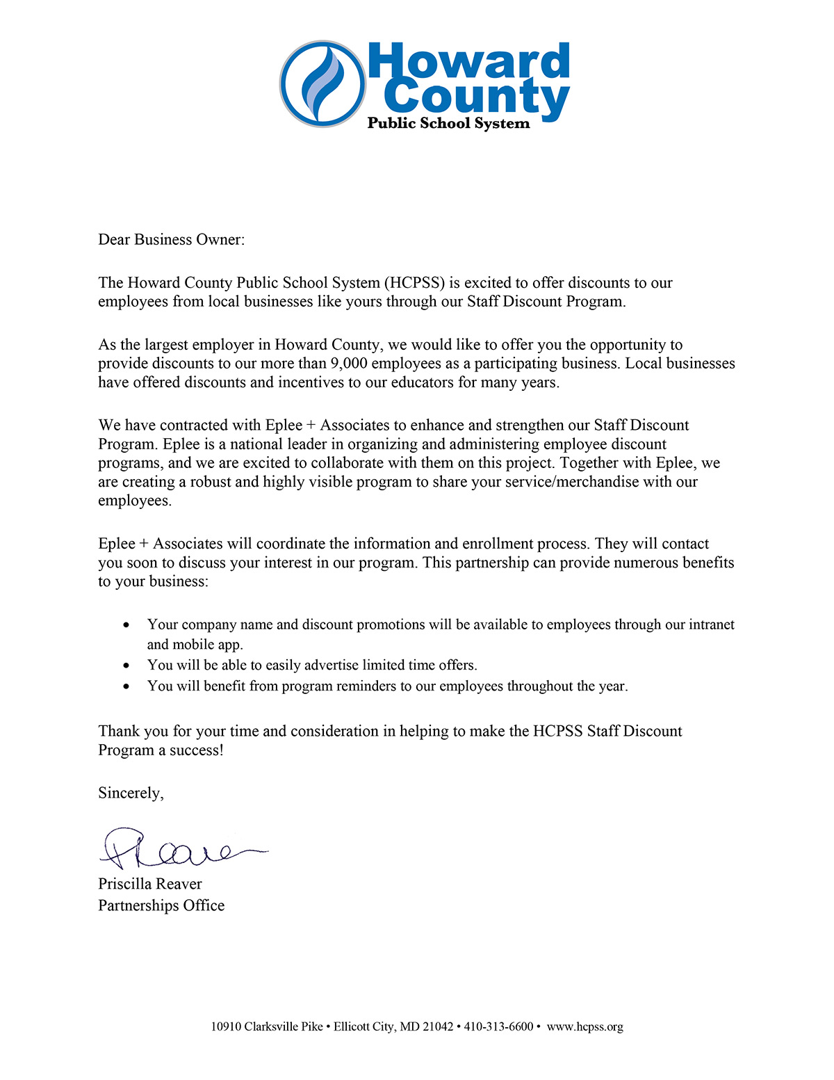 Participation is easy! Enroll with us to be included in Howard County Public School System Staff Discount Program and extend a discount or incentive to the HCPSS employees. You will be featured in the following ways: